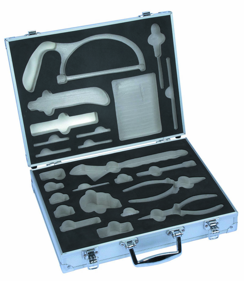 Para esto caja de herramientas de aluminio, fue diseñado para que las personas pongan herramientas. La espuma cortada en la parte inferior tiene forma de alicates, martillos y llaves.