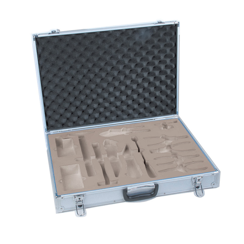 Para esto caja de herramientas de aluminio Fue diseñado para que las personas pongan herramientas. La espuma cortada en la parte inferior tiene forma de alicates, martillos y llaves.