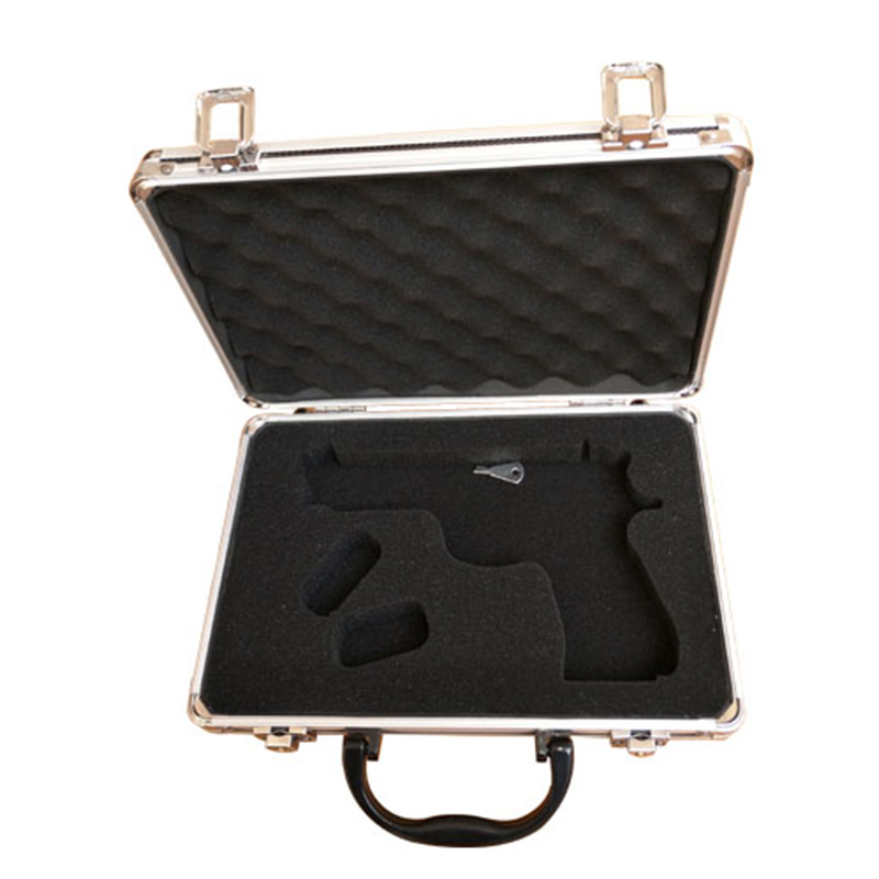 Esta funda de pistola está diseñada para la pistola de tapa. Por lo tanto, utiliza el perfil más pequeño para ahorrar costos. La superficie es de material ABS negro. Para dejar que el cliente ponga la pistola mejor, cortamos la forma de la pistola. Entonces podría caber muy bien arma. La otra parte es igual a la funda de pistola de estilo habitual.
